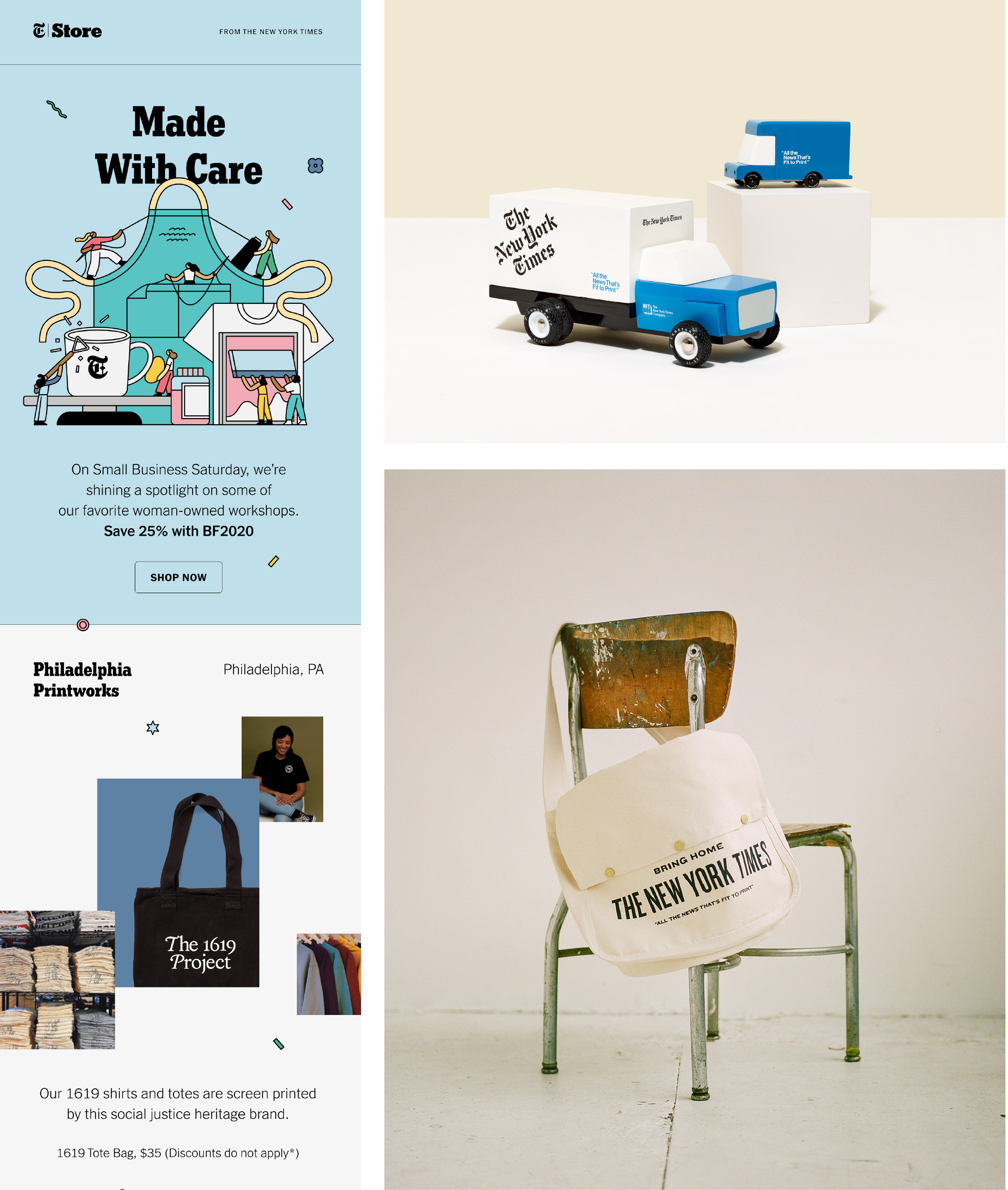 From 2017 to 2025, I served as the Creative Director for Commerce at The New York Times, with a primary focus on the New York Times Store. My role spanned the entire creative lifecycle of a product, from initial concept and development to sourcing makers and vendors, overseeing product photography, and managing the ecomm site and all marketing campaigns.